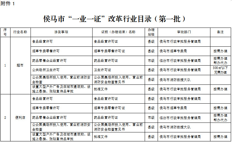附件:1.侯馬市“一業(yè)一證”改革行業(yè)目錄(第一批)