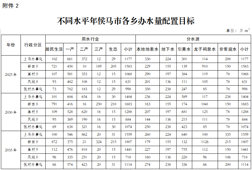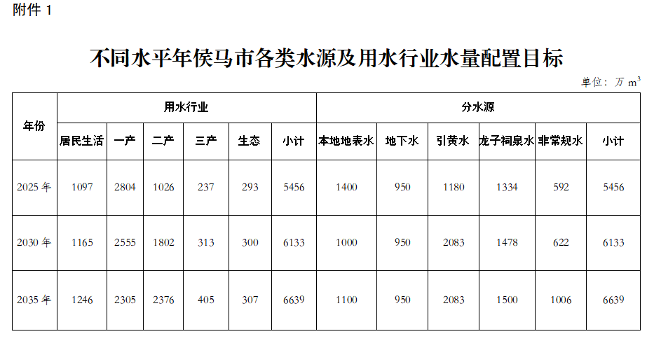 附件:1.不同水平年侯馬市各類水源及用水行業(yè)水量配置目標